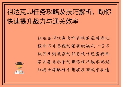 祖达克JJ任务攻略及技巧解析,助你快速提升战力与通关效率